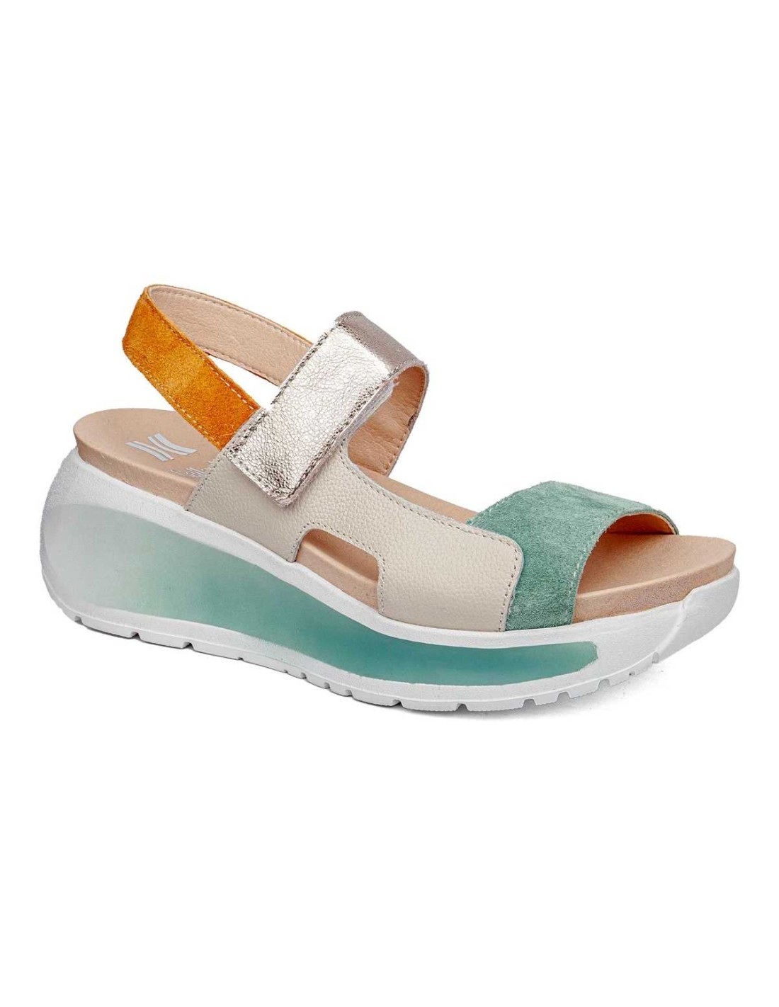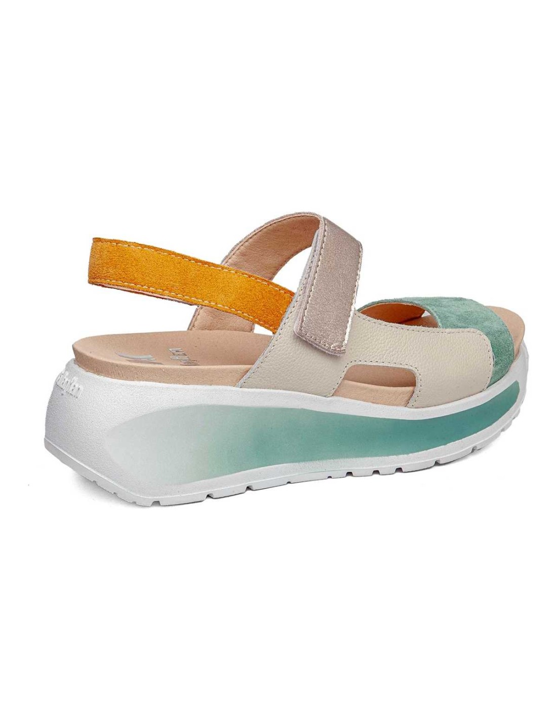 Sandalia en ante y piel combinada en color verde, con forro transpirable. Ajuste con velcro. Piso extralight.